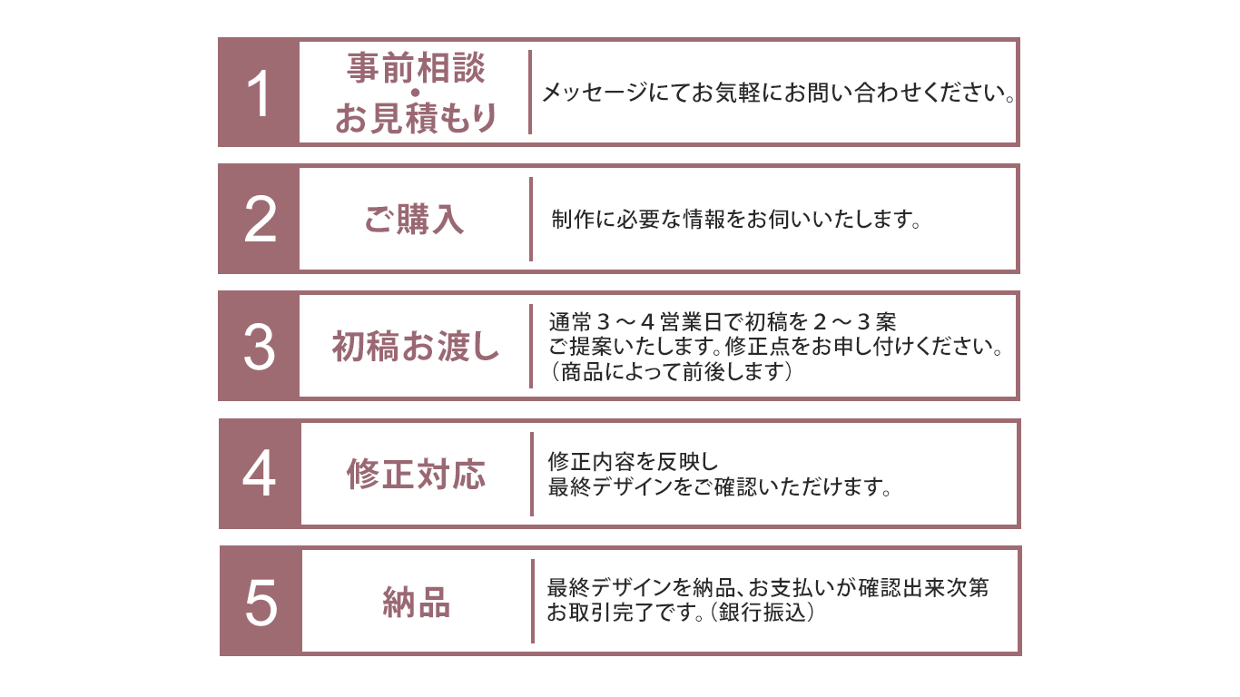 ふわっとしたイメージや、うまく言葉にできないご希望、まだ形になっていない想いや背景まで丁寧に受け取り「誰に・何を・どのように伝えるか」を言語化し一緒に整理いたします。どの商品でも複数のデザイン案をご提示することで、方向性を明確にしていきます。